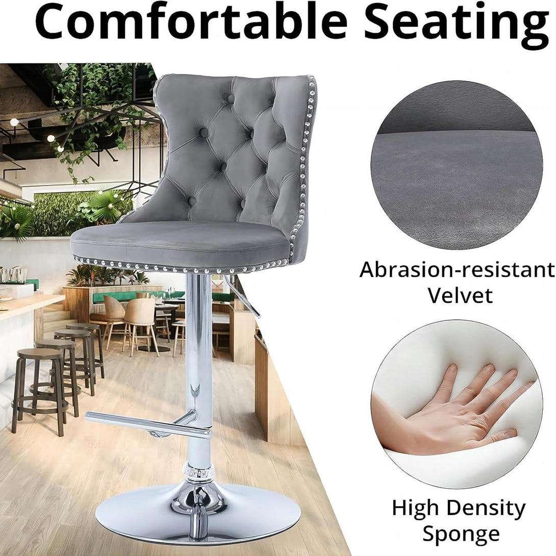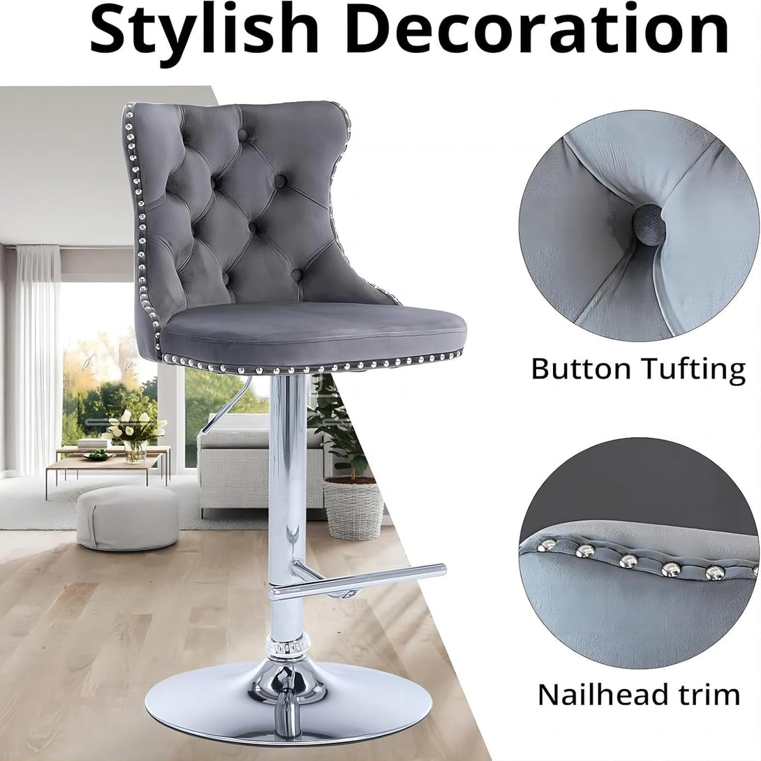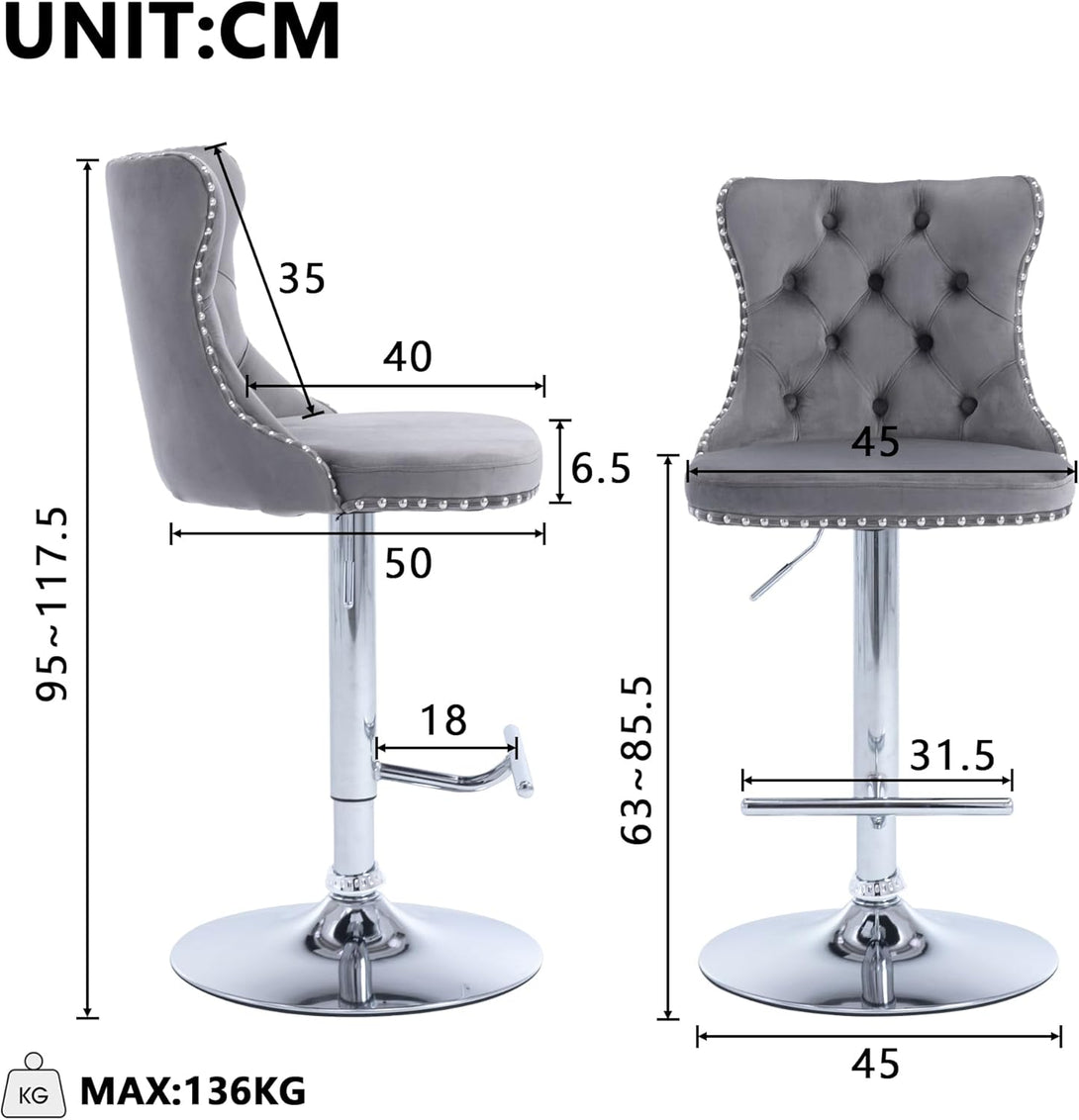 Breakfast Bar Stools Set of 2/4, Upholstered Velvet Kitchen Stools with Backs, Adjustable Swivel Gas Lift, Grey Studded Design Studded Kitchen Counter Chairs