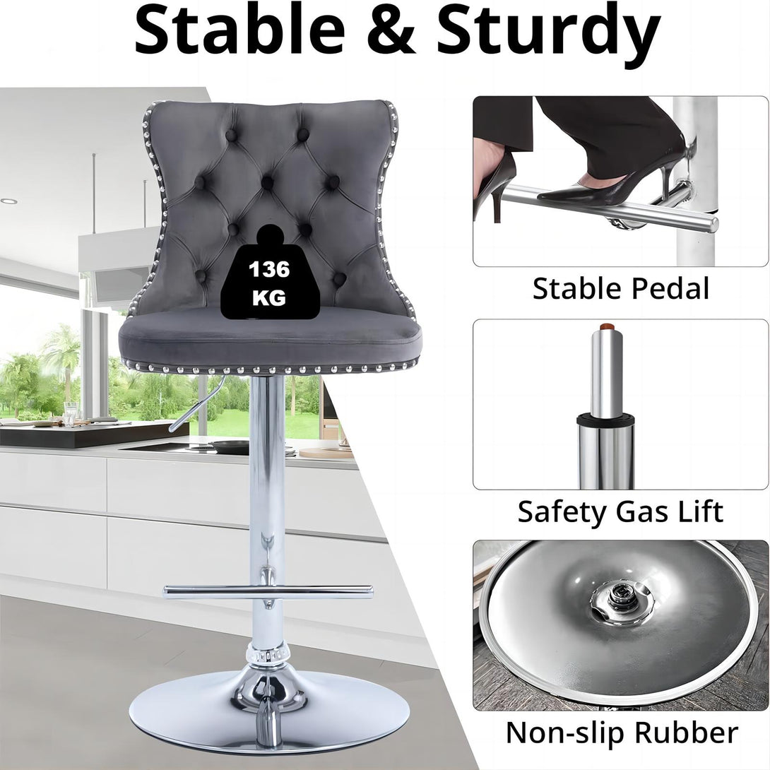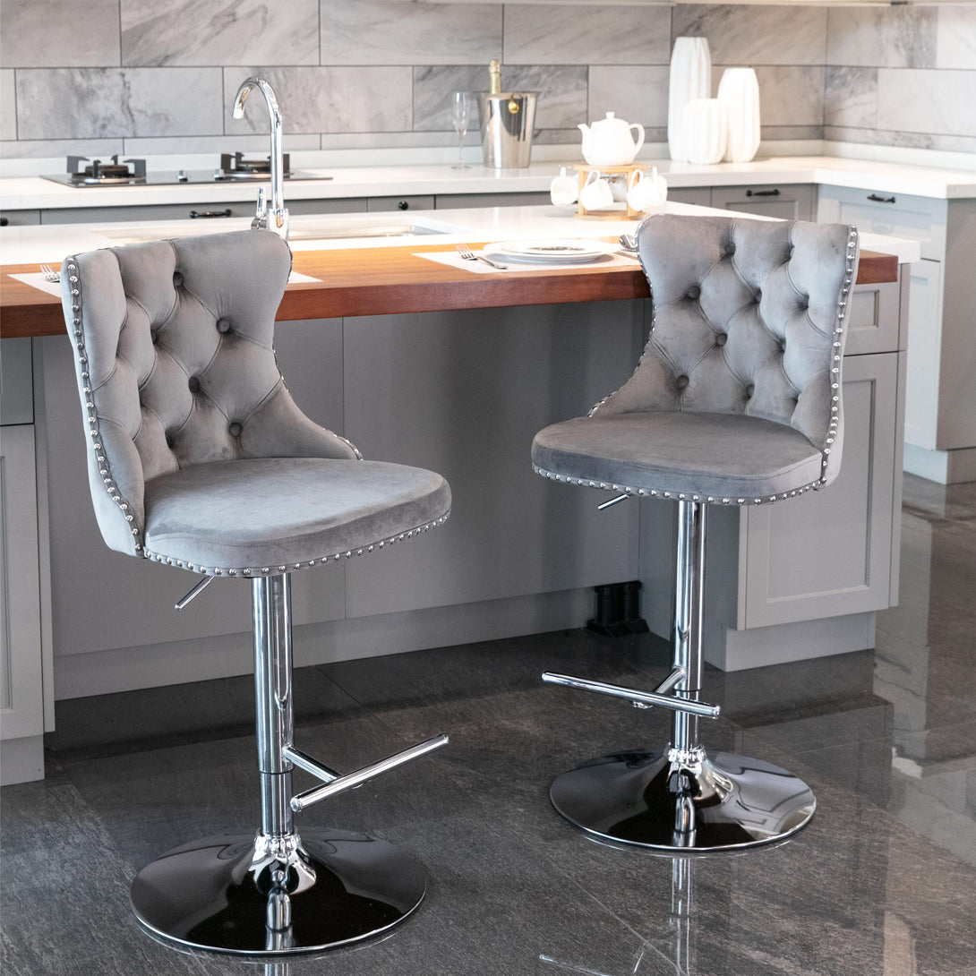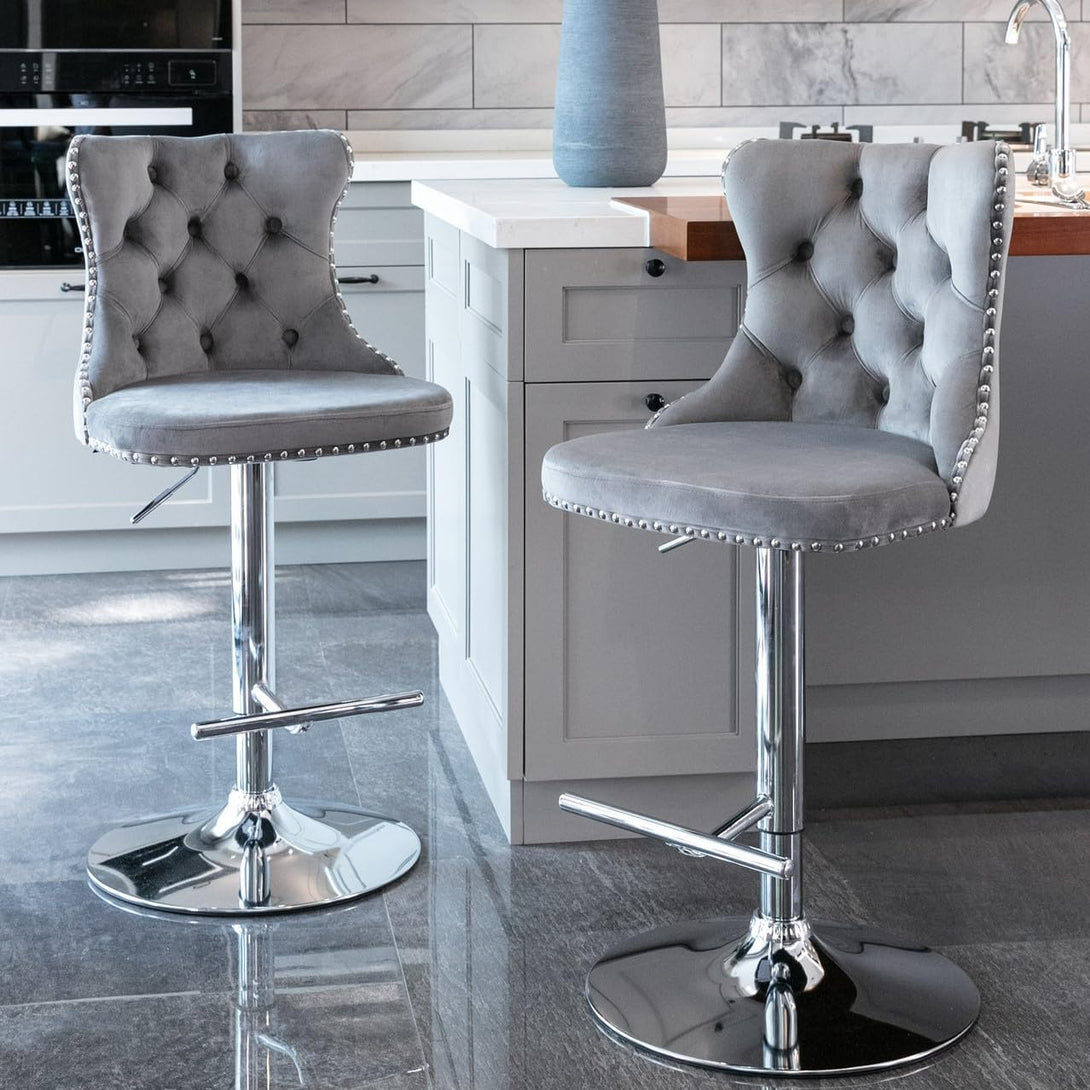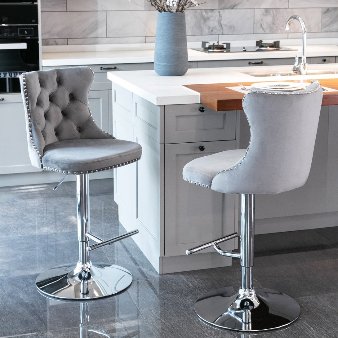 Breakfast Bar Stools Set of 2/4, Upholstered Velvet Kitchen Stools with Backs, Adjustable Swivel Gas Lift, Grey Studded Design Studded Kitchen Counter Chairs