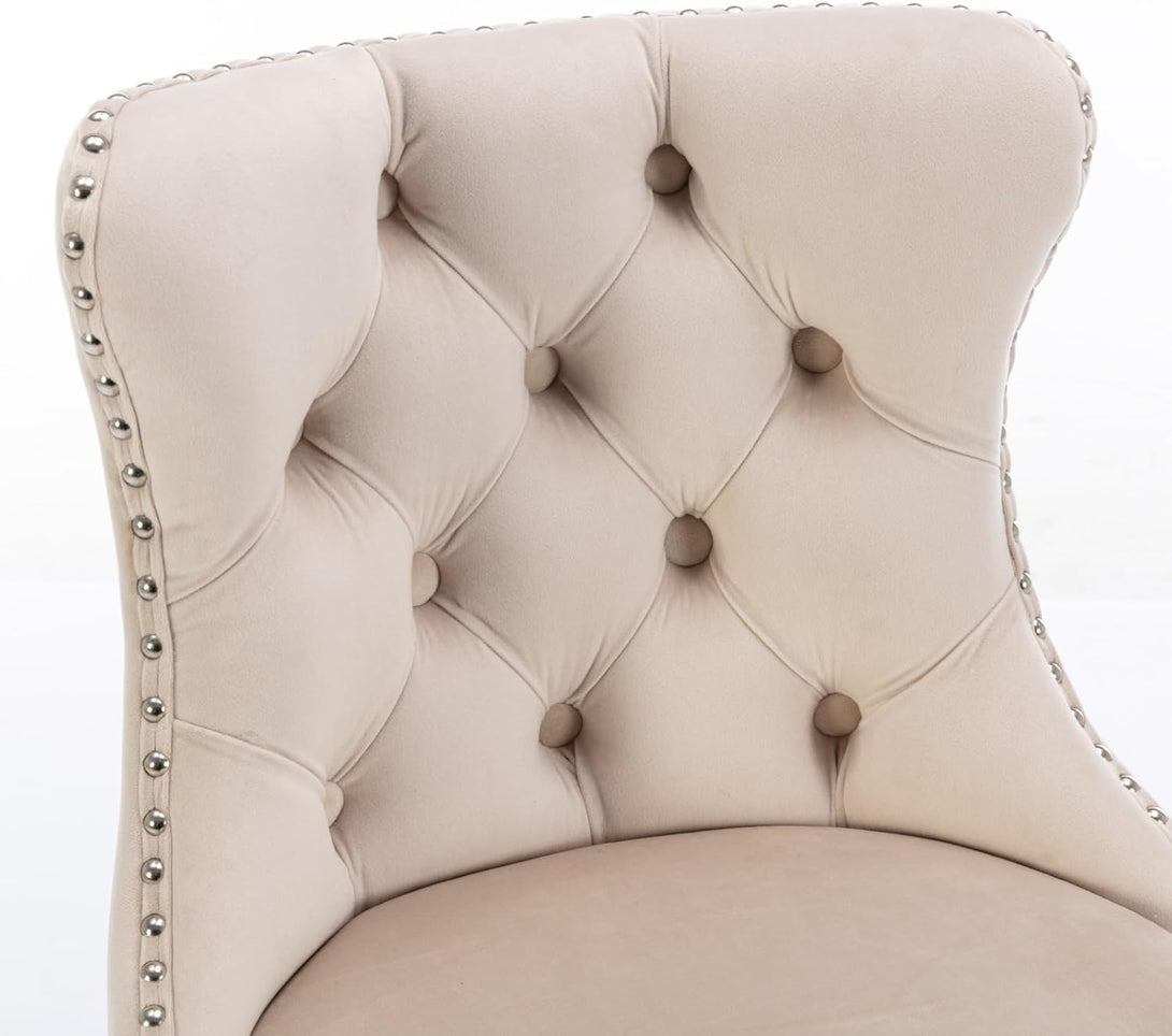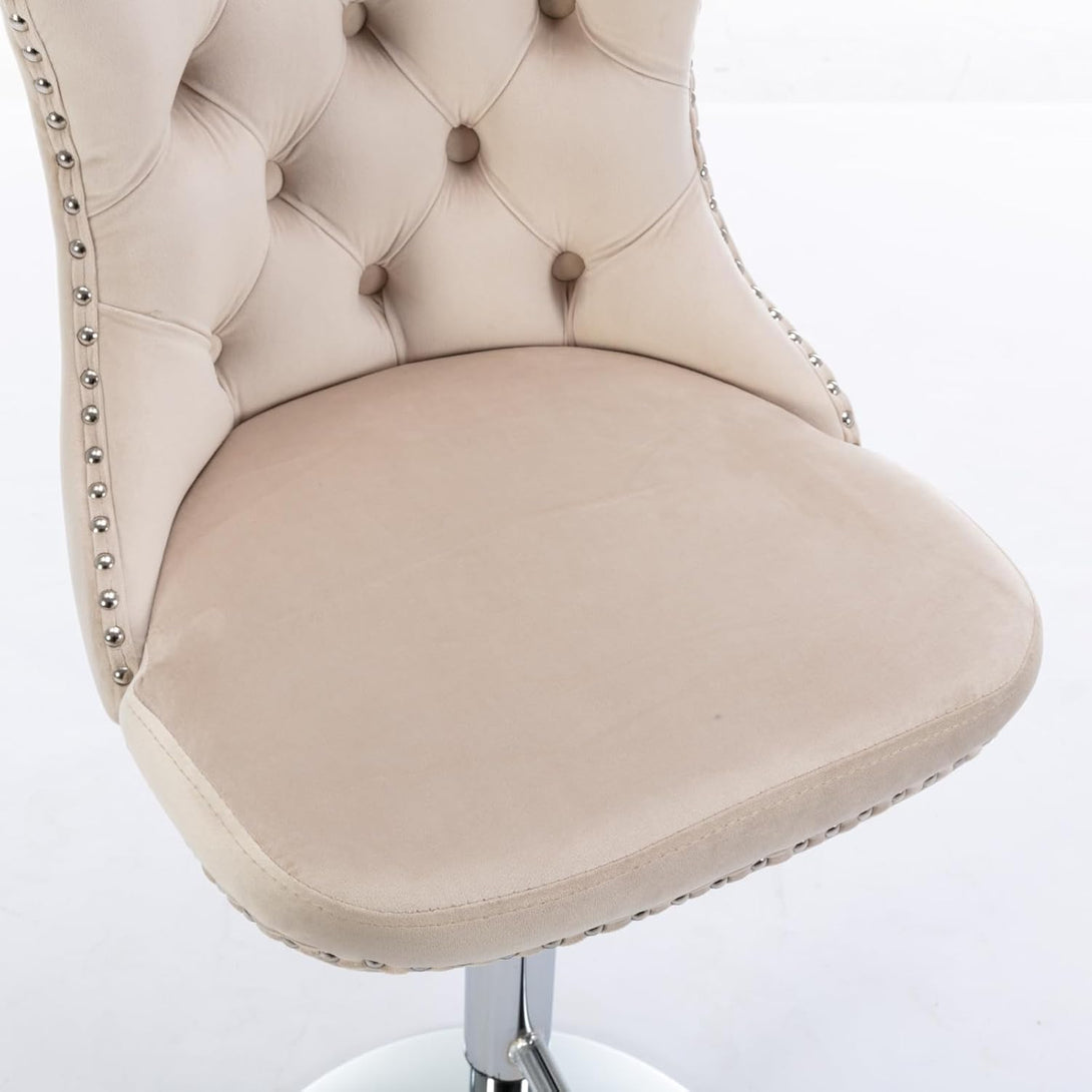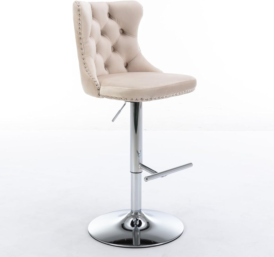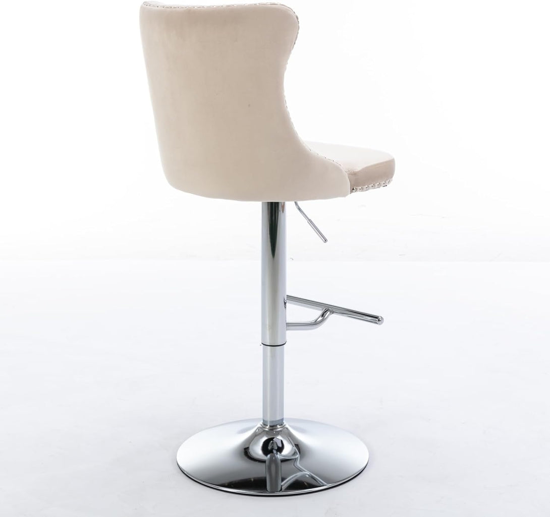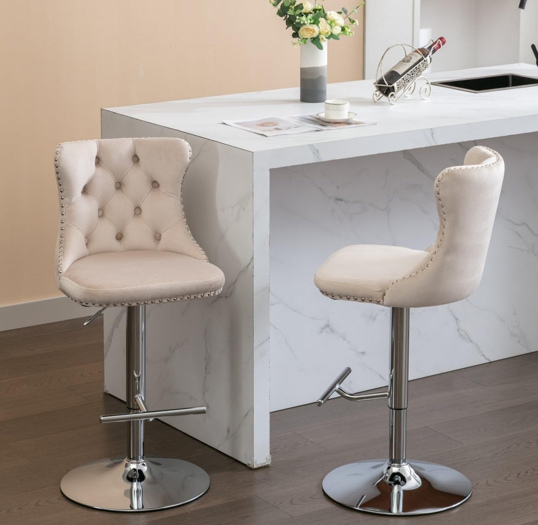 Breakfast Bar Stools Set of 2, Upholstered Velvet Kitchen Stools with Backs, Adjustable Swivel Gas Lift, Beige Studded Design Studded Kitchen Counter Chairs.